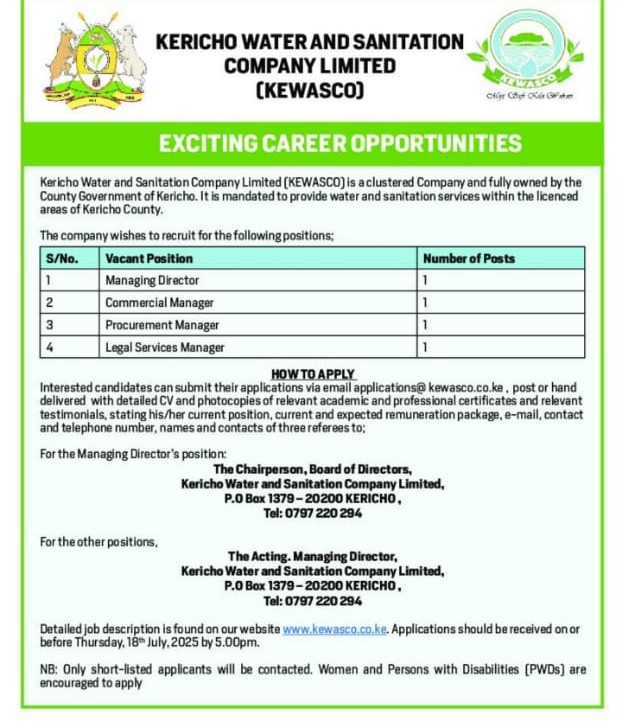 Kericho Water and Sanitation Company Limited (KEWASCO) is a clustered Company and fully owned by the County Government of Kericho. It is mandated to provide water and sanitation services within the licenced areas of Kericho County