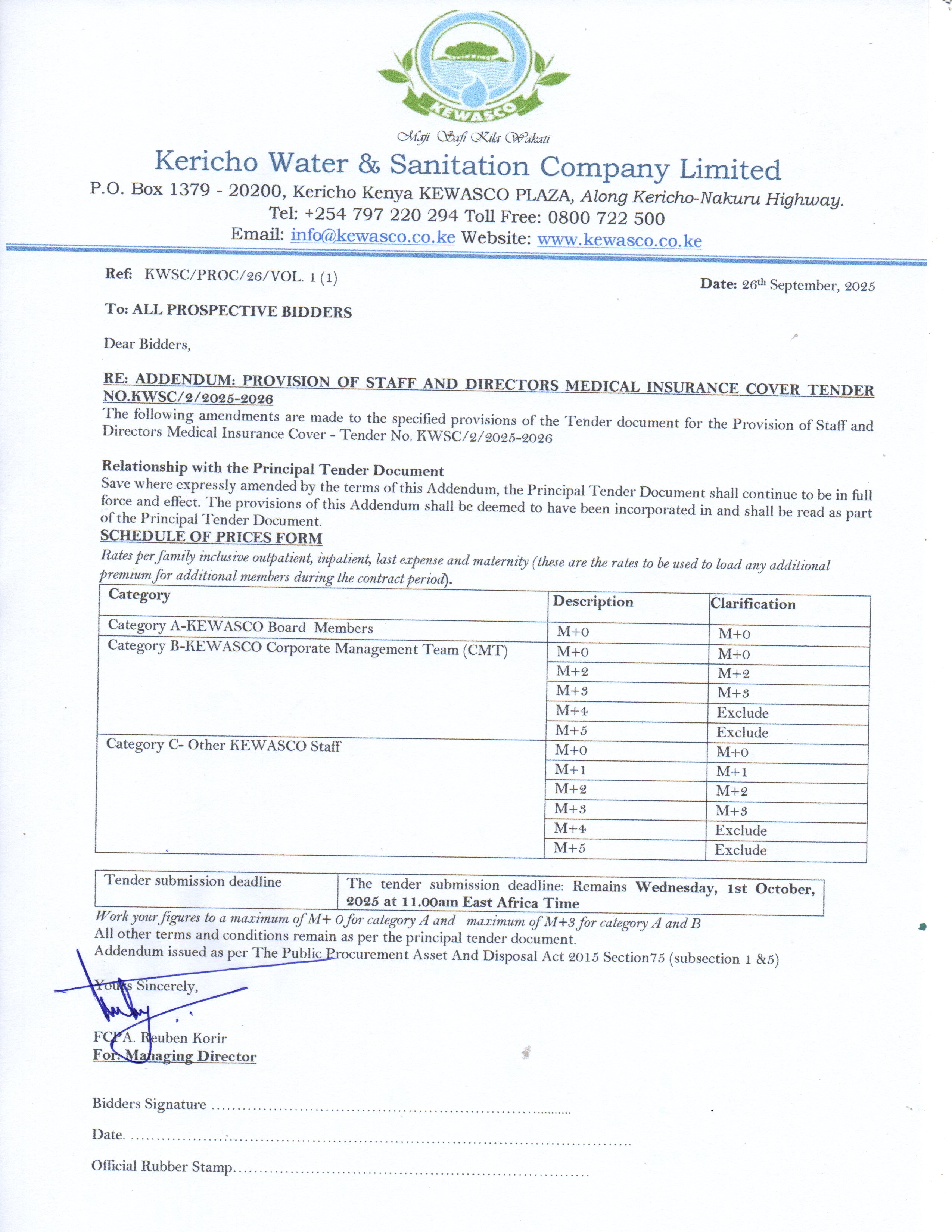 Kericho Water and Sanitation Company Limited (KEWASCO) invites Sealed Tenders for Registration of